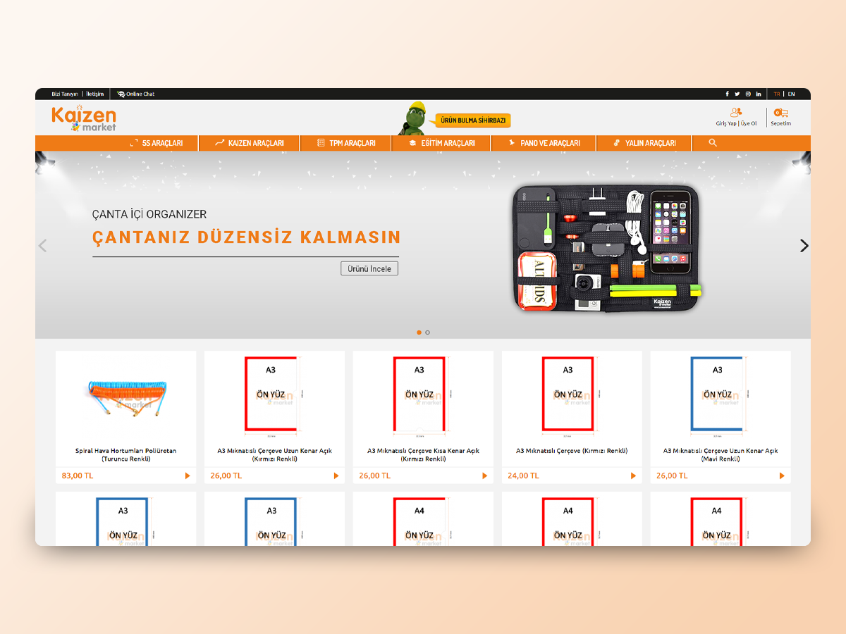 Kaizen Market, iyileştirme teknikleri ve kaizen uygulamaları üzerine hizmet veren bir firmadır. Carbon İnteraktif bünyesinde, Kaizen Market e-ticaret sitesinin front-end ve back-end çalışmalarında görev aldım.
